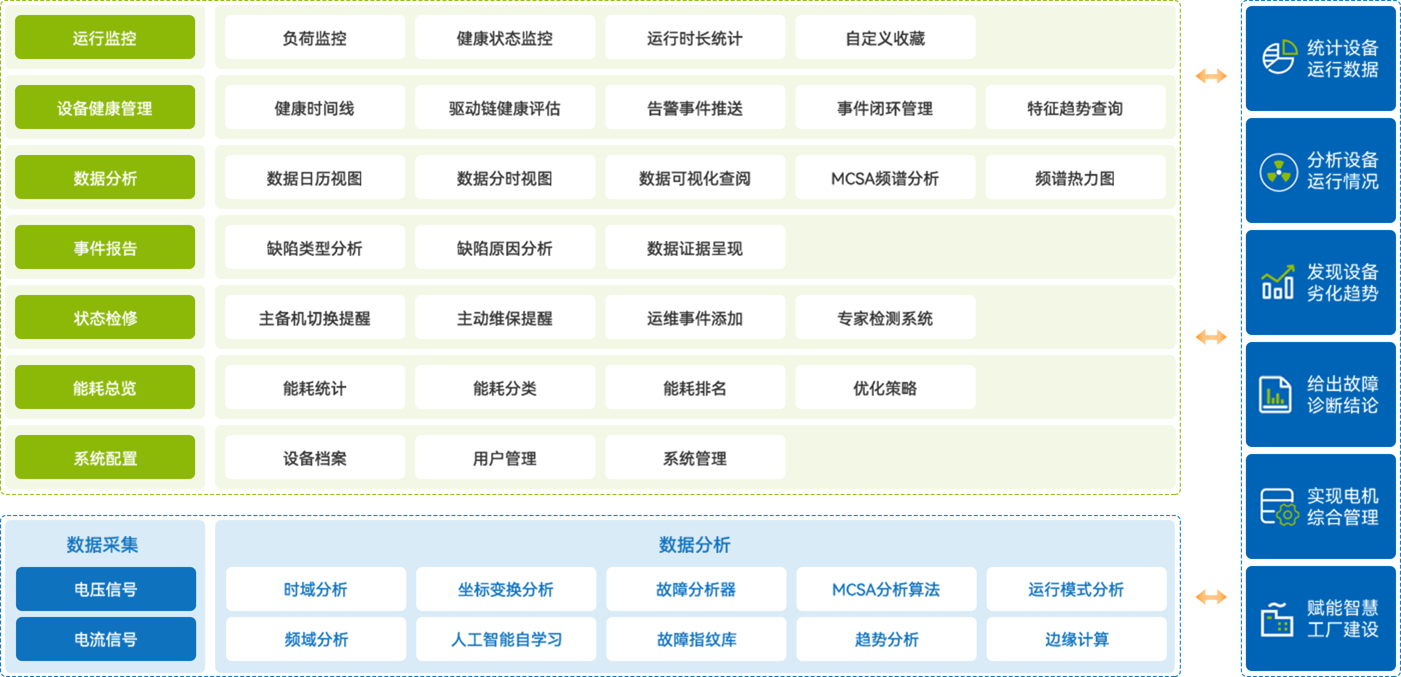 電機缺陷診斷系統(tǒng)通過電流特征分析實現(xiàn)電機故障的監(jiān)測,并根據(jù)故障信息完成故障的定位,系統(tǒng)除了具備電機健康監(jiān)測、運行分析、波形預(yù)覽、趨勢查閱等基礎(chǔ)監(jiān)測功能外,結(jié)合電機基本參數(shù)、運檢維修等功能開發(fā)更多高級應(yīng)用,可以實現(xiàn)電機檔案管理、運維消缺、保養(yǎng)維護及報表統(tǒng)計的智能運檢等輔助管理功能,實現(xiàn)電機的綜合管理,賦能智慧工廠的建設(shè)。