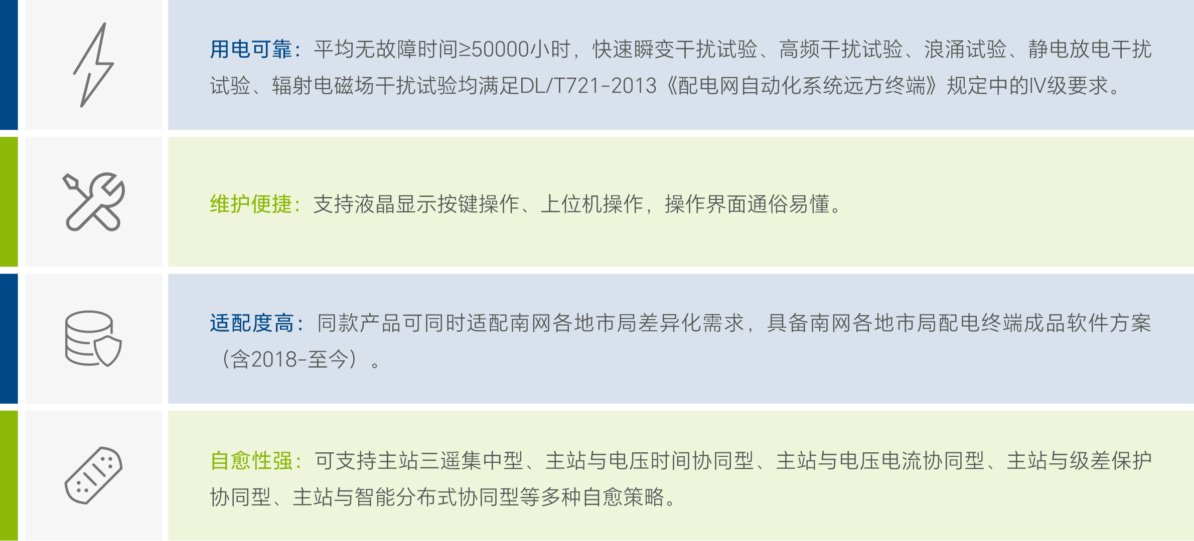 采用先進(jìn)的數(shù)字信號處理技術(shù)、高速工業(yè)網(wǎng)絡(luò)通信技術(shù)、嵌入式工業(yè)芯片組和多任務(wù)實時操作系統(tǒng);采用南網(wǎng)標(biāo)準(zhǔn)化設(shè)計,具備常規(guī)保護(hù)功能、就地饋線自動化保護(hù)功能、三遙集中型保護(hù)、四遙功能及遠(yuǎn)程運維功能等。